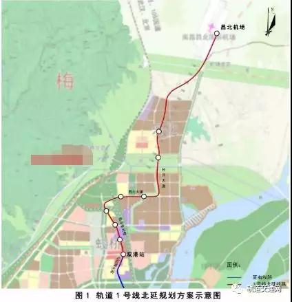 根據(jù)規(guī)劃方案,優(yōu)化調(diào)整后,地鐵1號線北延線南起雙港站,沿廬山中大道、昌北大道、經(jīng)開大道、規(guī)劃贛新大道北至昌北機(jī)場站,北延線全長16.62公里,共設(shè)地鐵站8座,平均站間距約2.1公里。