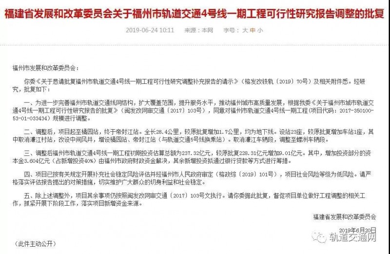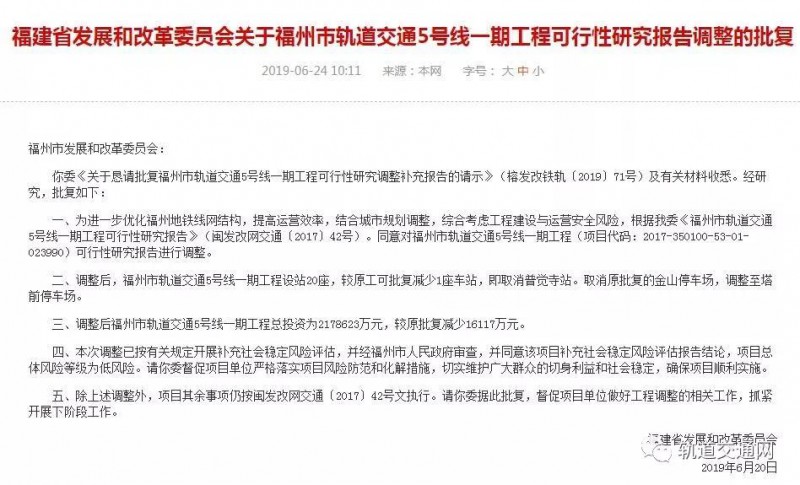 6月24日,福建省發(fā)展和改革委員會(huì)發(fā)布關(guān)于福州市軌道交通4號線一期、5號線一期工程可行性研究報(bào)告調(diào)整的批復(fù)。