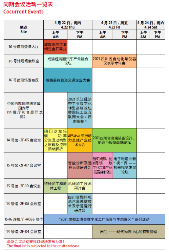 除了豐富的案例和產(chǎn)品展示,首屆成都工博會(huì)現(xiàn)場配套活動(dòng)也將精彩紛呈,涵蓋開幕式、展覽交易、以及結(jié)合西部地區(qū)工業(yè)制造市場特色策劃開展的系列高峰論壇等活動(dòng)。包括2021長江經(jīng)濟(jì)帶工業(yè)數(shù)字化轉(zhuǎn)型高峰論壇暨國際工業(yè)互聯(lián)網(wǎng)大會(huì)西南峰會(huì)、成渝經(jīng)濟(jì)圈汽車產(chǎn)業(yè)融合論壇、APS Asia亞洲動(dòng)力總成產(chǎn)業(yè)技術(shù)大會(huì)、2021四川省自動(dòng)化與儀器儀表學(xué)術(shù)年會(huì)、電子制造業(yè)新“視”界——機(jī)器視覺發(fā)展論壇、智能診斷及遠(yuǎn)程運(yùn)維研討會(huì)、2021四川省高端裝備設(shè)計(jì)、制造與服役高端論壇、智匯成都,創(chuàng)新引領(lǐng)——數(shù)字化工業(yè)產(chǎn)業(yè)發(fā)展高峰論壇、特種加工和流體工程、機(jī)械加工技術(shù)研討會(huì)、四川省燃料電池汽車關(guān)鍵技術(shù)及示范運(yùn)行研討會(huì)、現(xiàn)代物流中心的有效管理,上下游產(chǎn)業(yè)供需對接會(huì)等,緊扣行業(yè)熱點(diǎn)話題,將邀請科研院所專家及行業(yè)標(biāo)桿企業(yè)高層等到場分享與交流。展會(huì)同期還將舉辦“成德眉資軌道交通企業(yè)大會(huì)”,成都市城軌交通產(chǎn)業(yè)協(xié)會(huì)還將發(fā)布成都市軌道交通產(chǎn)業(yè)場景和機(jī)會(huì)清單,內(nèi)容涉及國家重大鐵路工程、成渝雙城經(jīng)濟(jì)圈成渝中線建設(shè)、成德眉資同城化市場清單等,為投資者、企業(yè)和人才提供軌交領(lǐng)域全面、準(zhǔn)確的發(fā)展入口和機(jī)會(huì)。成都工博會(huì)同期活動(dòng)主題均聚焦西部地區(qū)產(chǎn)業(yè)結(jié)構(gòu)的優(yōu)化調(diào)整,將助推區(qū)域產(chǎn)業(yè)協(xié)調(diào)發(fā)展