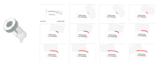 曲面打磨原理利用砂輪“自銳”特征,使用砂輪打磨后形成的弧面,僅用4-5片砂輪便能完全覆蓋鋼軌表面,其中至少有2組砂輪是鎖定在一個(gè)位置,因此在以下幾個(gè)方面有著特別的優(yōu)勢: