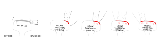 2.打磨遍數(shù):鑒于砂輪的不同組合,最少一遍可以實(shí)現(xiàn)新軌預(yù)打磨,達(dá)到去除脫碳層的目的。而打磨量較大的廓形修復(fù),一般6-8遍也能達(dá)到設(shè)計(jì)廓形。
