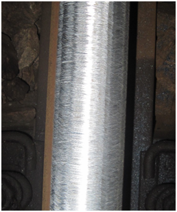 三是在濟(jì)南地鐵R1線進(jìn)行全線新軌預(yù)打磨。相關(guān)研究證明,新軌在開通前進(jìn)行預(yù)打磨對(duì)鋼軌,去除表面脫碳層和部分安裝時(shí)造成的病害,能在后期運(yùn)營中大大降低鋼軌出現(xiàn)疲勞傷損的幾率,尤其是微小裂紋、擦傷、焊接頭不平順等,能起到很好的消除作用。下圖11為打磨線路后的宏觀表面。