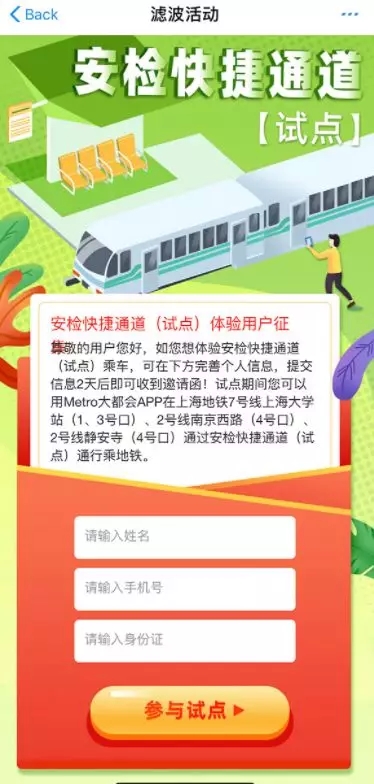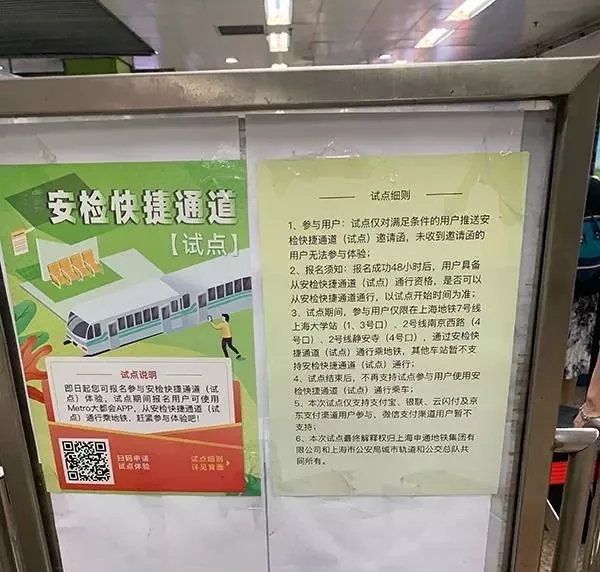 答:目前采取邀請制和申請制結(jié)合的方法。上海地鐵對上述3座車站符合要求的且在“METRO大都會”APP實(shí)名注冊的常乘客(高峰時(shí)段有多次進(jìn)站記錄),發(fā)出《上海地鐵乘客安檢快捷通道測試邀請函》。乘客在接受邀請并簽訂《上海地鐵乘客安檢快捷通道(試點(diǎn))業(yè)務(wù)開通服務(wù)協(xié)議》后,可在上述3座車站持APP通過安檢快捷通道刷碼進(jìn)站乘車。同時(shí),為進(jìn)一步擴(kuò)大試點(diǎn)范圍,在2號線靜安寺站和2號線南京西路站開通掃碼申請,經(jīng)審核通過后同樣可以參與試點(diǎn)。