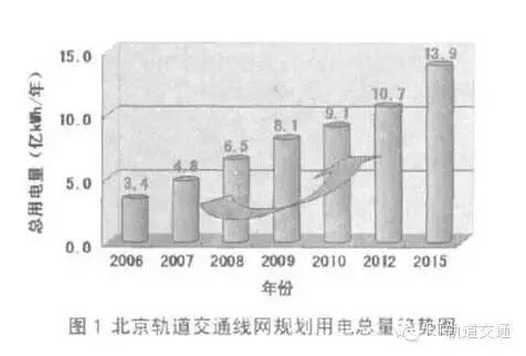 能源消耗總量過(guò)大是目前城市軌道交通面臨的一大問(wèn)題。軌道交通運(yùn)營(yíng)成本高居不下的問(wèn)題日顯突出,其中有近50%來(lái)自于列車(chē)牽引能耗。按照目前我國(guó)城市軌道交通的發(fā)展速度,城市軌道交通的能耗將達(dá)到相當(dāng)?shù)囊?guī)模。應(yīng)該說(shuō),盡快找到大幅降低軌道交通運(yùn)行能耗的方法,已成為保持城市軌道交通高速度可持續(xù)發(fā)展必須解決的重要問(wèn)題之一。北京軌道交通線網(wǎng)規(guī)劃用電總量的趨勢(shì)圖如圖1所示。