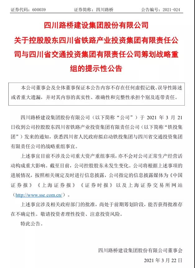 3月22日,四川路橋發(fā)布公告稱,收到公司控股股東鐵投集團(tuán)發(fā)來的通知,四川省人民政府?dāng)M啟動鐵投集團(tuán)與四川省交通投資集團(tuán)有限責(zé)任公司的戰(zhàn)略重組事宜。上述事宜涉及到相關(guān)部門的批準(zhǔn),尚處于前期籌劃階段,能否獲得批準(zhǔn),存在不確定性。