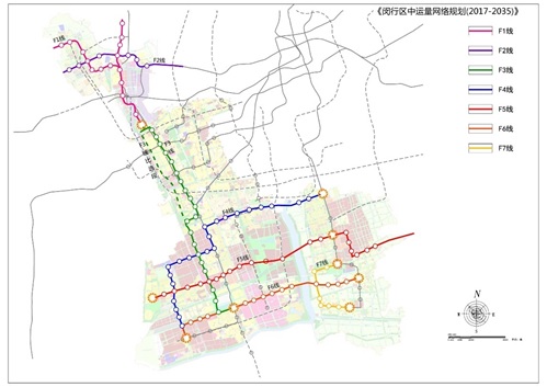 (1)線網(wǎng)規(guī)劃:規(guī)劃閔行區(qū)共7條中運量線路,分別為F1線、F2線、F3線、F4線、F5線、F6線和F7線,總長約118.3km。同時對部分通道進行規(guī)劃研究。