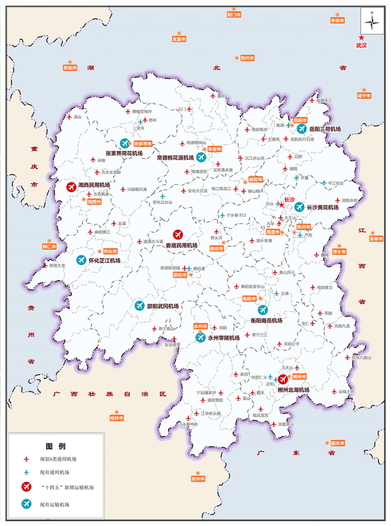 4.“一樞紐一干線九支線多點(diǎn)”:一樞紐,長(zhǎng)沙黃花機(jī)場(chǎng);一干線,張家界荷花機(jī)場(chǎng);九支線,常德桃花源、永州零陵、懷化芷江、衡陽(yáng)南岳、邵陽(yáng)武岡、岳陽(yáng)三荷、郴州北湖、湘西、婁底等機(jī)場(chǎng);多點(diǎn),全省通用機(jī)場(chǎng)(含通航基地、臨時(shí)起降點(diǎn))。