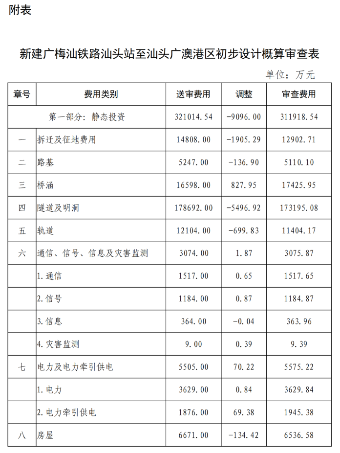 附表:新建廣梅汕鐵路汕頭站至汕頭廣澳港區(qū)初步設(shè)計概算審查表