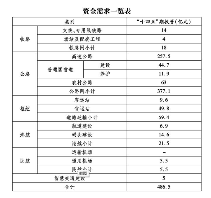 “十四五”期間,我市綜合交通運(yùn)輸建設(shè)項(xiàng)目概算資金約486.5億元。其中:鐵路建設(shè)總投資18億元;公路建設(shè)資金377.1億元(含高速公路投資約257.5億元,普通國(guó)省道投資56.6億元,農(nóng)村公路投資63億元);樞紐場(chǎng)站建設(shè)投資59.4億元;港航建設(shè)投資21.5億元,民航建設(shè)投資5.5億元;智慧交通建設(shè)投資5億元。
