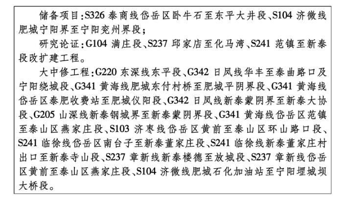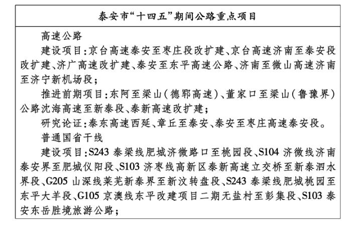 (1)完善高速公路主骨架。加快推進(jìn)京臺(tái)高速泰安至棗莊段改擴(kuò)建項(xiàng)目,確保2021年年內(nèi)建成通車;積極推進(jìn)京臺(tái)高速濟(jì)南至泰安段改擴(kuò)建、泰安至東平高速公路、濟(jì)廣高速濟(jì)南至菏澤段改擴(kuò)建、濟(jì)微高速濟(jì)南至濟(jì)寧新機(jī)場(chǎng)段建設(shè),確保“十四五”期間建成通車;配合推進(jìn)德鄆高速東阿至梁山段、董家口至梁山(魯豫界)公路沈海高速至新泰段、泰新高速改擴(kuò)建等項(xiàng)目前期工作;積極開(kāi)展章丘至泰安、泰安至棗莊高速泰安段、泰東高速西延項(xiàng)目研究論證。