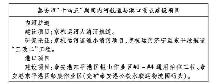 3.加快內(nèi)河航道與港口建設(shè)。優(yōu)化港口功能布局,突出港區(qū)發(fā)展重點(diǎn)。京杭運(yùn)河大清河航道建成通航,泰安港東平港區(qū)銀山作業(yè)區(qū)、彭集作業(yè)區(qū)一期工程(兗礦泰安港公鐵水聯(lián)運(yùn)物流園碼頭)建成投入使用,努力將泰安港打造成為多種運(yùn)輸方式銜接、功能齊全的省會(huì)經(jīng)濟(jì)圈內(nèi)河航運(yùn)樞紐?!笆奈濉蹦?,實(shí)現(xiàn)投入使用的千噸級(jí)泊位數(shù)17個(gè),三級(jí)航道通航里程達(dá)到50.69公里,港口年吞吐量達(dá)到1840萬(wàn)噸。