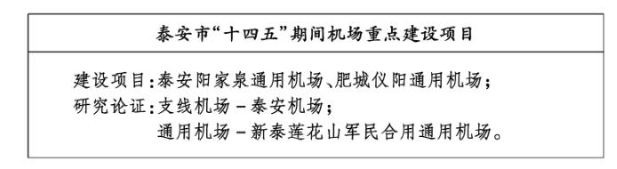 4.推進(jìn)機(jī)場(chǎng)項(xiàng)目規(guī)劃建設(shè)。完善運(yùn)輸機(jī)場(chǎng)功能、推進(jìn)通用機(jī)場(chǎng)建設(shè)。積極推進(jìn)泰安陽(yáng)家泉(徂徠山)通用機(jī)場(chǎng)、儀陽(yáng)通用機(jī)場(chǎng)規(guī)劃建設(shè),適時(shí)推進(jìn)泰安機(jī)場(chǎng)、新泰市蓮花山軍民合用通用機(jī)場(chǎng)項(xiàng)目的規(guī)劃研究工作。