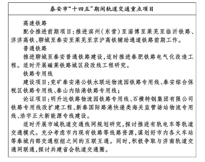 1.推進(jìn)軌道交通網(wǎng)絡(luò)建設(shè)。積極配合推進(jìn)聊城至泰安至萊蕪至京滬高鐵輔助通道鐵路等高速鐵路及聊城至泰安等普通貨運(yùn)鐵路項(xiàng)目前期工作。加快推進(jìn)兗礦泰安港公鐵水聯(lián)運(yùn)物流園等物流園區(qū)及企業(yè)鐵路專用線建設(shè),促進(jìn)“公轉(zhuǎn)鐵”運(yùn)輸,適時(shí)推進(jìn)泰肥鐵路電氣化改造工程,研判磁萊鐵路城區(qū)段改線工程。適時(shí)開(kāi)展市域軌道交通線網(wǎng)規(guī)劃研究,推進(jìn)城市軌道交通建設(shè)。積極爭(zhēng)取與濟(jì)南軌道交通網(wǎng)聯(lián)通,探討共建省會(huì)軌道交通圈,深度融入省會(huì)經(jīng)濟(jì)圈、加快推進(jìn)濟(jì)泰同城化進(jìn)程。