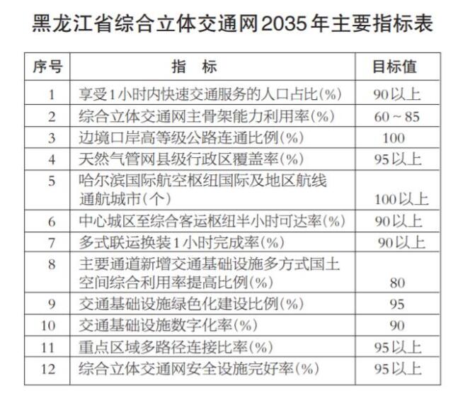 建成哈爾濱(哈大綏)國際性綜合交通樞紐城市,形成黑龍江省輻射東北、聯(lián)動國內(nèi)、聯(lián)通全球的核心樞紐;建成齊齊哈爾等全國/區(qū)域性綜合交通樞紐城市和一批高效能、多層次、廣覆蓋的客貨樞紐港站。