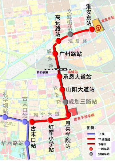規(guī)劃線路:近期建設(shè)規(guī)劃線路為有軌電車1號線支線,線路起于古末口站,止于淮安東站高鐵站,全長約7.42km,擬設(shè)站10座(含起終點站),均為地面站。