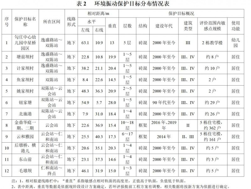 沿線聲環(huán)境評價(jià)范圍內(nèi)共有3處聲環(huán)境保護(hù)目標(biāo),均為居民點(diǎn)(見表1);振動(dòng)環(huán)境評價(jià)范圍內(nèi)共有12處振動(dòng)環(huán)境保護(hù)目標(biāo),包括11處居民點(diǎn)和1處幼兒園(見表2);排風(fēng)亭大氣評價(jià)范圍內(nèi)有3處大氣環(huán)境保護(hù)目標(biāo)(同表1);沿線不涉及自然保護(hù)區(qū)、風(fēng)景名勝區(qū)、飲用水水源保護(hù)區(qū)、生態(tài)保護(hù)紅線、文物保護(hù)單位。