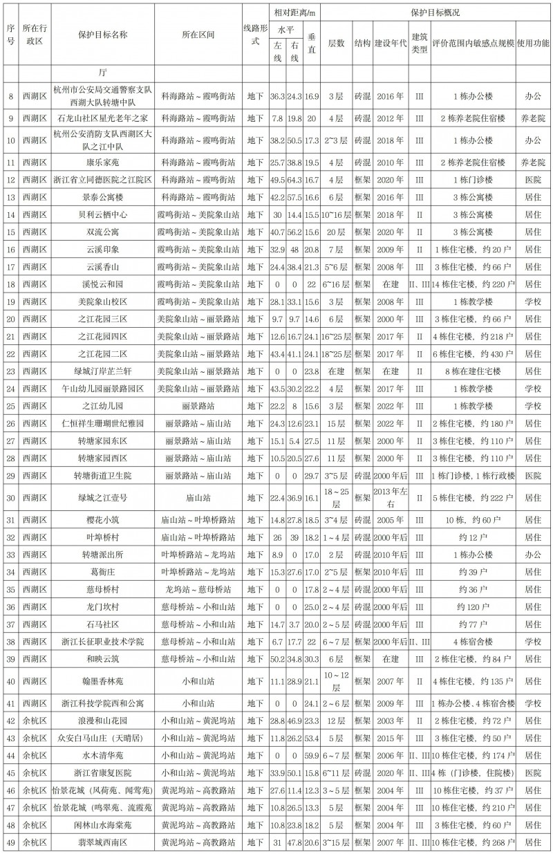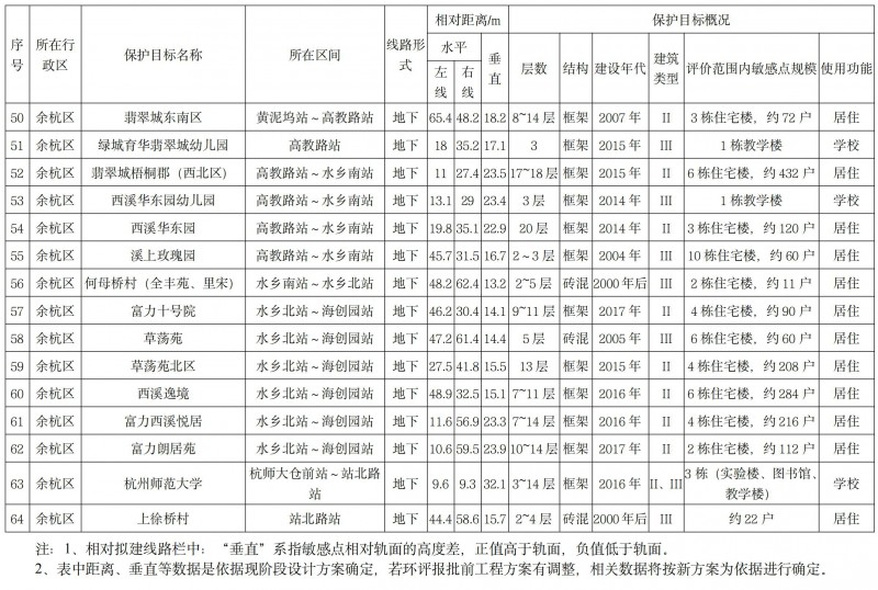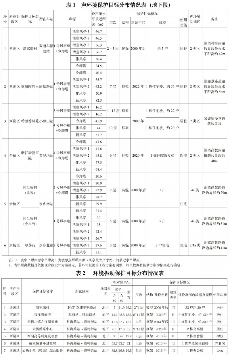 沿線聲環(huán)境評價范圍內共有6處保護目標,其中居民點5處,醫(yī)院1處(見下表1)。振動環(huán)境評價范圍內共有64處現狀保護目標,其中住宅45處,學校9處,醫(yī)院3處,行政辦公4處,養(yǎng)老機構3處(見下表2)。排風亭大氣評價范圍內有3處大氣環(huán)境保護目標(同表1)。生態(tài)環(huán)境評價范圍內有西山國家森林公園,杭州海塘省級文物保護單位以及古蕩-老和山-余杭街道歷代古墓葬重點保護區(qū)。新建1座主變電所周邊無電磁環(huán)境保護目標。項目不涉及飲用水水源保護區(qū)。