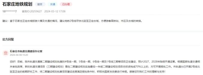 石家莊市軌道交通建設(shè)辦公室回復(fù):