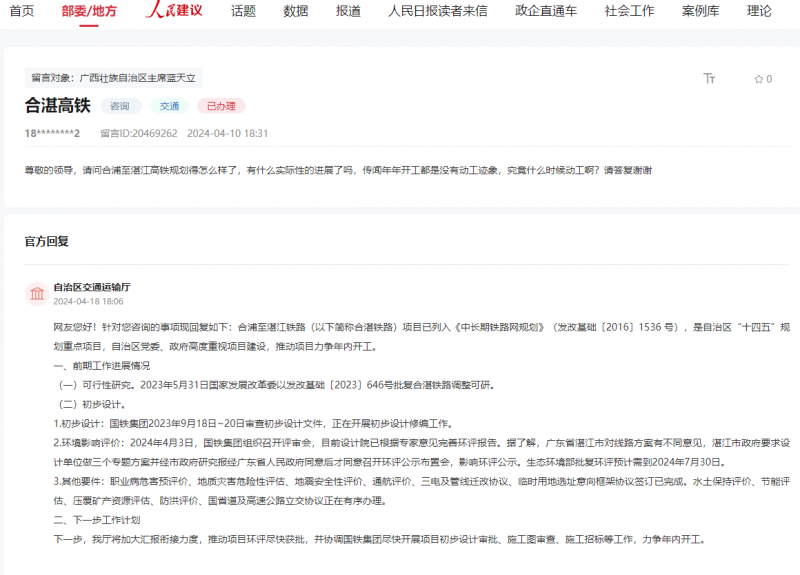 網(wǎng)友您好!針對您咨詢的事項現(xiàn)回復(fù)如下:合浦至湛江鐵路(以下簡稱合湛鐵路)項目已列入《中長期鐵路網(wǎng)規(guī)劃》(發(fā)改基礎(chǔ)〔2016〕1536 號),是自治區(qū)“十四五”規(guī)劃重點項目,自治區(qū)黨委、政府高度重視項目建設(shè),推動項目力爭年內(nèi)開工。 一、前期工作進展情況 (一)可行性研究。2023年5月31日國家發(fā)展改革委以發(fā)改基礎(chǔ)〔2023〕646號批復(fù)合湛鐵路調(diào)整可研。 (二)初步設(shè)計。 1.初步設(shè)計:國鐵集團2023年9月18日~20日審查初步設(shè)計文件,正在開展初步設(shè)計修編工作。 2.環(huán)境影響評價:2024年4月3日,國鐵集團組織召開評審會,目前設(shè)計院已根據(jù)專家意見完善環(huán)評報告。據(jù)了解,廣東省湛江市對線路方案有不同意見,湛江市政府要求設(shè)計單位做三個專題方案并經(jīng)市政府研究報經(jīng)廣東省人民政府同意后才同意召開環(huán)評公示布置會,影響環(huán)評公示。生態(tài)環(huán)境部批復(fù)環(huán)評預(yù)計需到2024年7月30日。 3.其他要件:職業(yè)病危害預(yù)評價、地質(zhì)災(zāi)害危險性評估、地震安全性評價、通航評價、三電及管線遷改協(xié)議、臨時用地選址意向框架協(xié)議簽訂已完成。水土保持評價、節(jié)能評估、壓覆礦產(chǎn)資源評估、防洪評價、國省道及高速公路立交協(xié)議正在有序辦理。 二、下一步工作計劃 下一步,我廳將加大匯報銜接力度,推動項目環(huán)評盡快獲批,并協(xié)調(diào)國鐵集團盡快開展項目初步設(shè)計審批、施工圖審查、施工招標等工作,力爭年內(nèi)開工。
