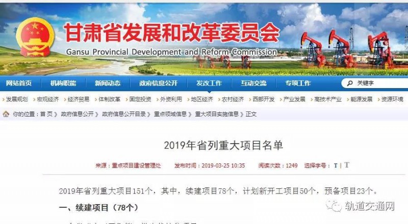 3月25日,甘肅省發(fā)改委網(wǎng)站公布《2019年省列重大項(xiàng)目名單》。名單顯示,2019年省列重大項(xiàng)目151個(gè),其中,續(xù)建項(xiàng)目78個(gè),計(jì)劃新增開(kāi)工項(xiàng)目50個(gè),預(yù)備項(xiàng)目23個(gè)。其中軌交項(xiàng)目續(xù)建7項(xiàng)、計(jì)劃新增開(kāi)工4項(xiàng)。包括蘭州市軌道交通1號(hào)線一期工程、蘭州市軌道交通2號(hào)線一期工程、天水市有軌電車(chē)示范線工程(一期)3項(xiàng)城市軌道交通,以及8項(xiàng)鐵路工程。