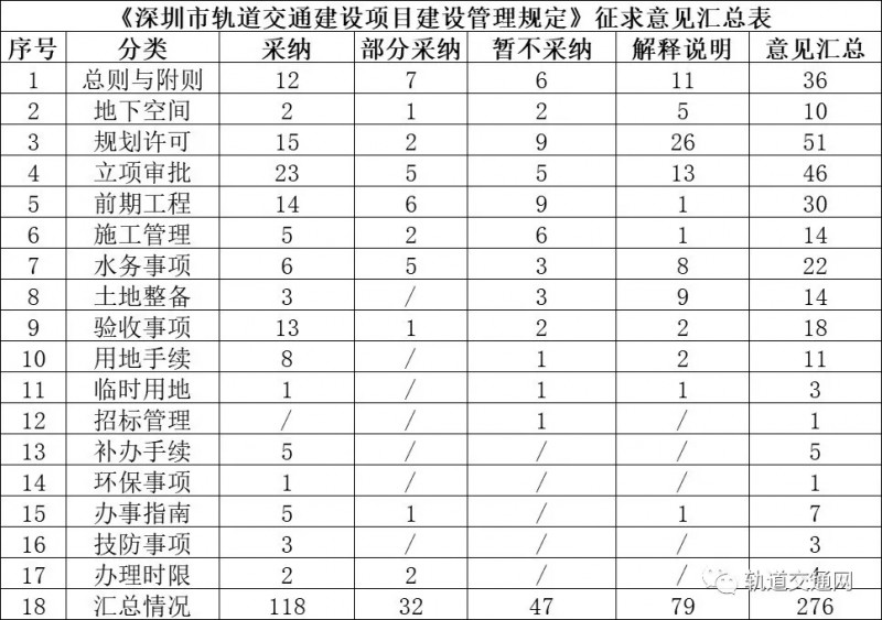 經(jīng)三輪征求意見,共收到276條會議意見及書面意見。經(jīng)梳理并對意見進行分類,意見采納情況如下:各單位提出的276條意見中,主要集中在總則與附則36條(12.9%)、地下空間10條(3.6%)、規(guī)劃許可51條(18.5%)、立項審批46條(16.7%)、前期工程30條(10.9%)、施工管理14條(5%)、水務事項22條(7.9%)、土地整備14條(5%)、驗收事項18條(6.5%)、用地手續(xù)11條(3.9%)、臨時用地3條(1%)、招標管理1條(0.4%)、補辦手續(xù)5條(1.8%)、環(huán)保事項1條(0.4%)、辦理指南7條(2.5%)、技防事項3條(3.9%)、辦理時限4條(1.4%)。