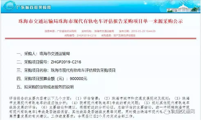 5月29日,廣東省政府采購網(wǎng)發(fā)布《珠海市交通運(yùn)輸局珠海市現(xiàn)代有軌電車評估報告采購項目單一來源采購公示》(以下簡稱“《公示》”)稱,珠海正委托中國國際工程咨詢有限公司評估有軌電車項目,評估報告的主要內(nèi)容包括:珠海市城市和交通發(fā)展現(xiàn)狀及規(guī)劃;珠海市發(fā)展現(xiàn)代有軌電車的適應(yīng)性分析;既有現(xiàn)代有軌電車1號線的有關(guān)問題;規(guī)劃其他現(xiàn)代有軌電車線路發(fā)展的評估等?!豆尽贩Q,評估將進(jìn)一步明確珠海市既有現(xiàn)代有軌電車1號線是否繼續(xù)保留、其他線路是否繼續(xù)發(fā)展等問題。