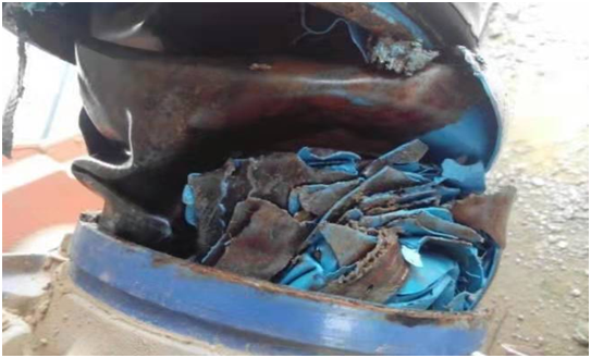 華中地區(qū)某城市地鐵二號線采用襯塑鋼管,運行5年后,襯塑內壁嚴重分層脫落,造成空調管路堵塞,停機。