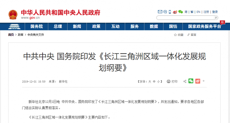 12月1日,中共中央、國(guó)務(wù)院印發(fā)了《長(zhǎng)江三角洲區(qū)域一體化發(fā)展規(guī)劃綱要》。