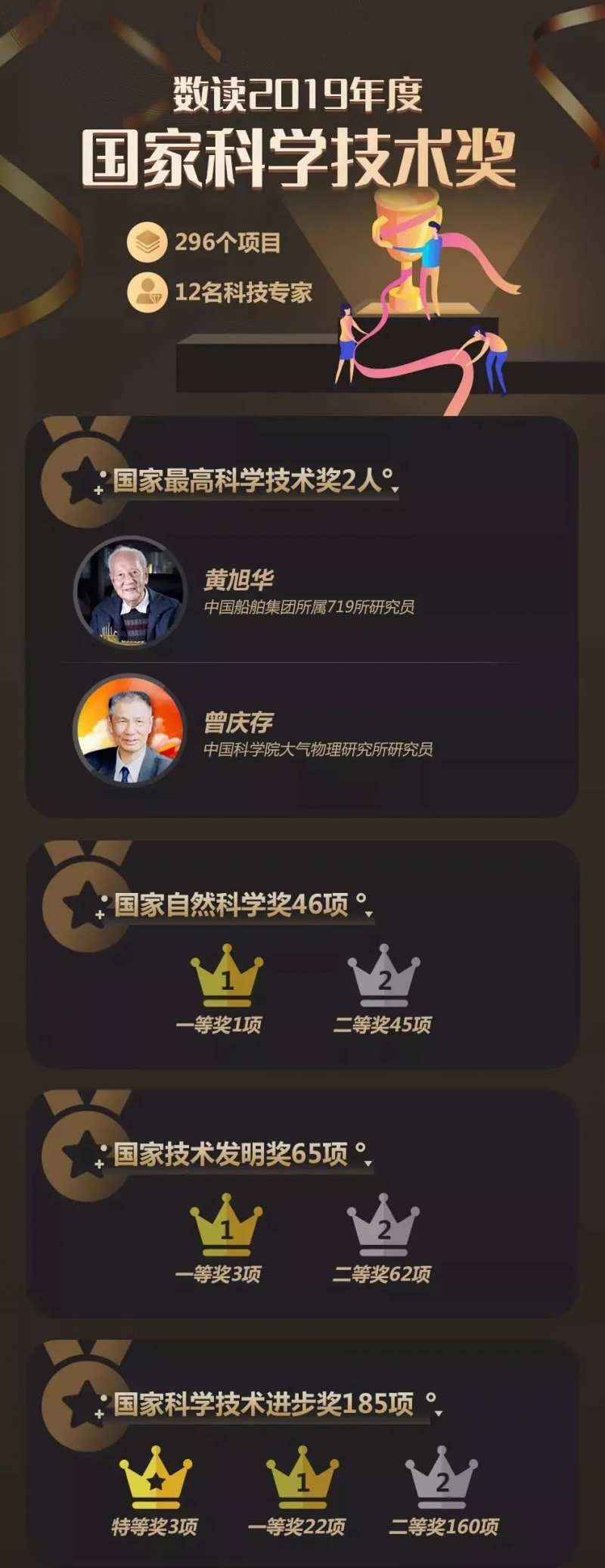 國(guó)家最高科學(xué)技術(shù)獎(jiǎng)2人:中國(guó)工程院院士黃旭華和中國(guó)科學(xué)院院士曾慶存;