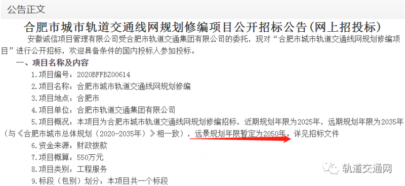 合肥市2050年城市軌道交通線路規(guī)劃啟動(dòng)招標(biāo)。
