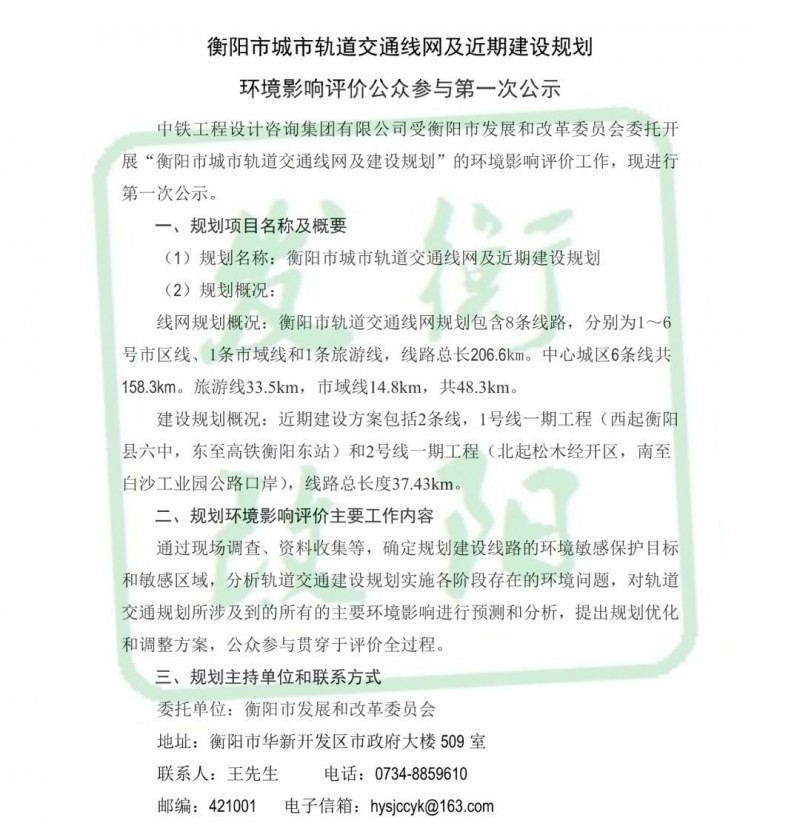 6月20日,衡陽市發(fā)改委官方公眾號(hào)發(fā)布了衡陽市城市軌道交通線網(wǎng)及近期建設(shè)規(guī)劃環(huán)境影響評(píng)價(jià)公眾參與第一次公示。