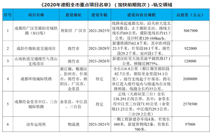 5月20日,德陽公布《2020年全市重點(diǎn)項(xiàng)目名單》,共計(jì)三份,分《2020年全市重點(diǎn)項(xiàng)目名單》(加快前期批次)、《2020年全市重點(diǎn)項(xiàng)目名單》(續(xù)建批次)、《2020年全市重點(diǎn)項(xiàng)目名單》(新開工批次)。