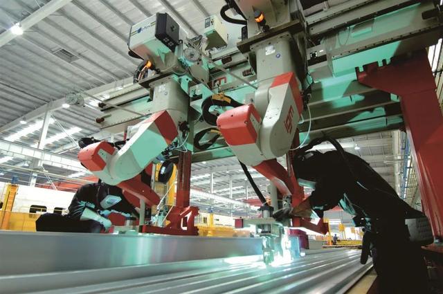 工人正在中車四方股份公司高速動(dòng)車組車體數(shù)字化焊接生產(chǎn)線上忙碌。