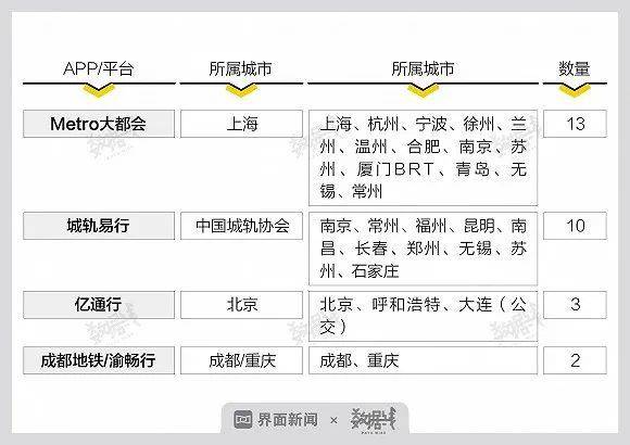 目前,已有23個(gè)城市接入互聯(lián)互通平臺(tái)。除了城軌易行,其他平臺(tái)都有較強(qiáng)地域性。Metro大都會(huì)以上海為中心輻射長(zhǎng)三角地區(qū),億通行聚焦北方,西南地區(qū)成渝互通。