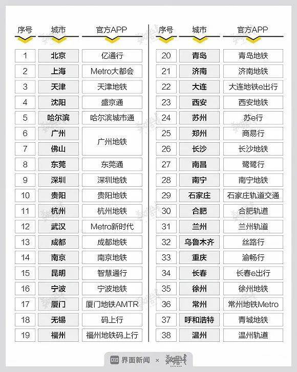 記者梳理,38個(gè)地鐵城市均上線了官方APP,最主要的功能是掃碼乘車。一些城市也將閘機(jī)入口開放給微信、支付寶、銀聯(lián)等公司。