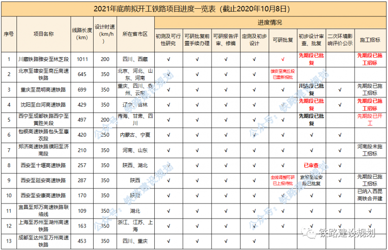 9月底,川藏鐵路、成西鐵路、雄商高鐵等國鐵干線前期工作取得重大進(jìn)展。本次更新內(nèi)容如下,項(xiàng)目詳細(xì)內(nèi)容和進(jìn)度情況請搜索公眾號內(nèi)往期文章: