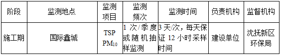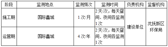 建議在國(guó)際鑫城設(shè)置施工期和運(yùn)營(yíng)期環(huán)境空氣和環(huán)境噪聲監(jiān)測(cè)點(diǎn)位,本工程環(huán)境監(jiān)測(cè)計(jì)劃分為環(huán)境空氣、噪聲兩部分,具體見表5~表6所示。