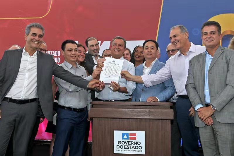 在巴伊亞州長魯伊科斯塔(演講桌左)和駐巴西大使楊萬明(演講桌右)的見證之下,比亞迪被授予薩爾瓦多云軌一期工程的開工許可證