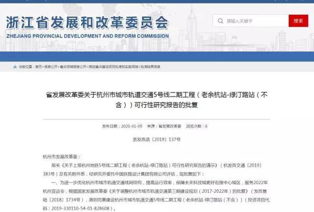 1月9日,浙江省發(fā)展和改革委員會官網(wǎng)顯示,關(guān)于杭州市城市軌道交通5號線二期工程(老余杭—綠汀路(不含))可行性研究報告獲批。這標志著,距離地鐵5號線二期開通又進了一步。