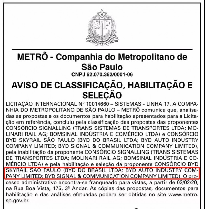 繼巴西薩爾瓦多云軌線整體設(shè)計方案獲批,項目即將正式開工的消息公布1個月后,當?shù)貢r間2020年2月1日,比亞迪又成功拿下巴西圣保羅市軌道交通17號線項目。