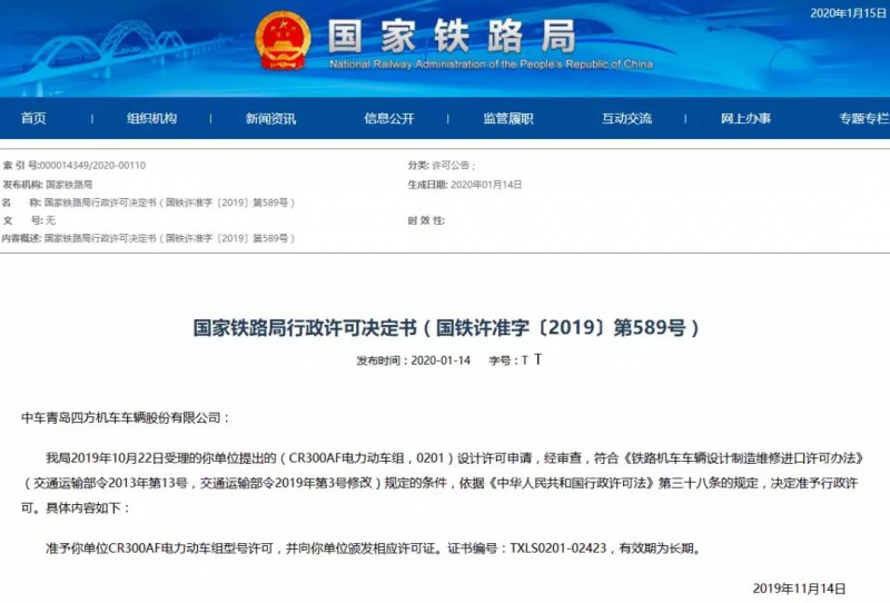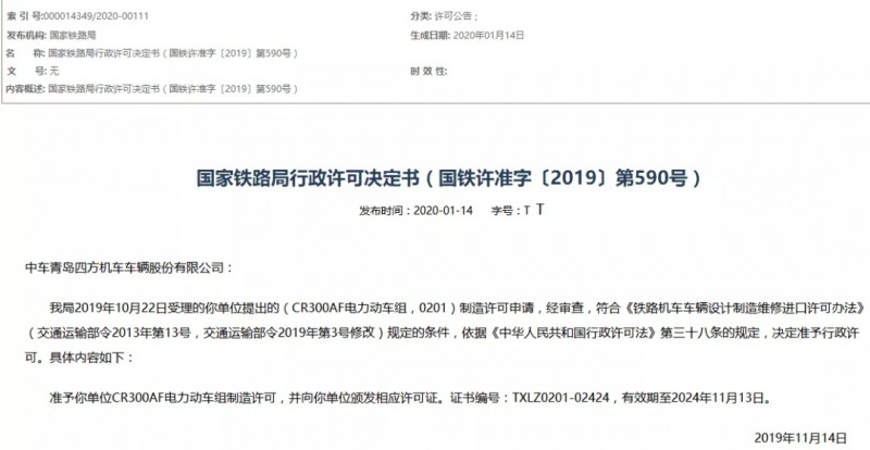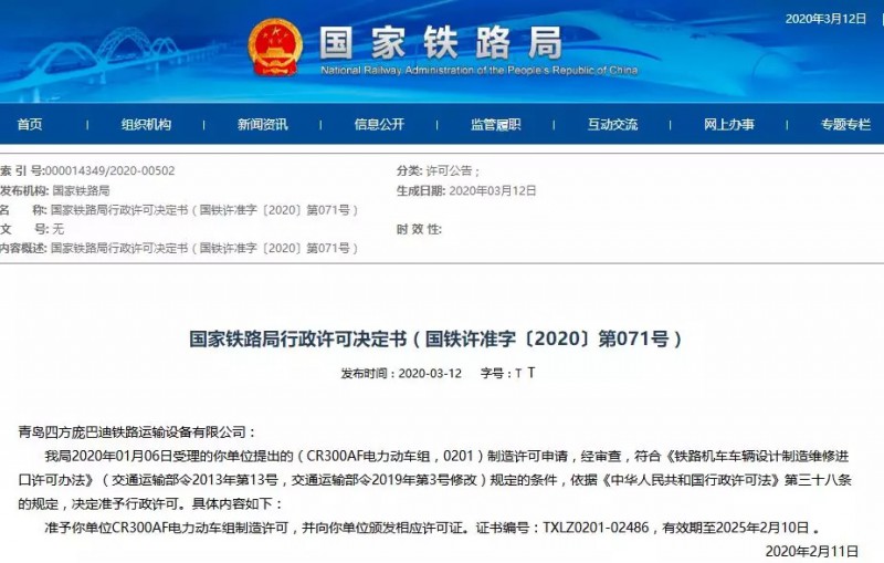 青島四方龐巴迪鐵路運(yùn)輸設(shè)備有限公司: 我局2020年01月06日受理的你單位提出的(CR300AF電力動(dòng)車組,0201)制造許可申請(qǐng),經(jīng)審查,符合《鐵路機(jī)車車輛設(shè)計(jì)制造維修進(jìn)口許可辦法》(交通運(yùn)輸部令2013年第13號(hào),交通運(yùn)輸部令2019年第3號(hào)修改)規(guī)定的條件,依據(jù)《中華人民共和國行政許可法》第三十八條的規(guī)定,決定準(zhǔn)予行政許可。具體內(nèi)容如下: 準(zhǔn)予你單位CR300AF電力動(dòng)車組制造許可,并向你單位頒發(fā)相應(yīng)許可證。證書編號(hào):TXLZ0201-02486,有效期至2025年2月10日。 2020年2月11日