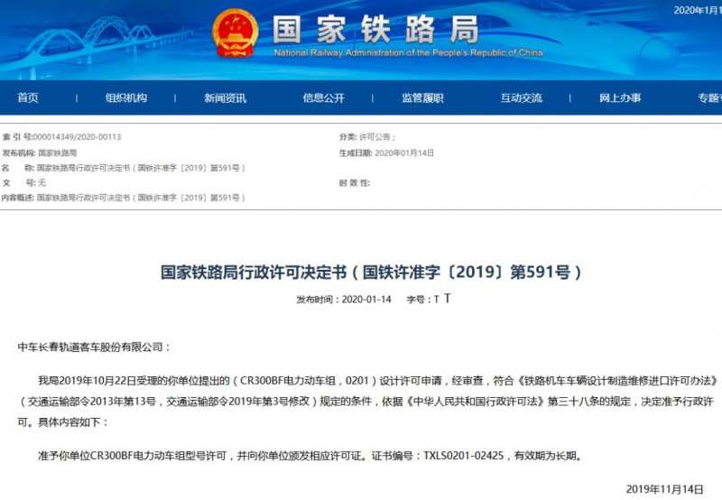 我局2019年10月22日受理的你單位提出的(CR300AF電力動(dòng)車組,0201)制造許可申請(qǐng),經(jīng)審查,符合《鐵路機(jī)車車輛設(shè)計(jì)制造維修進(jìn)口許可辦法》(交通運(yùn)輸部令2013年第13號(hào),交通運(yùn)輸部令2019年第3號(hào)修改)規(guī)定的條件,依據(jù)《中華人民共和國行政許可法》第三十八條的規(guī)定,決定準(zhǔn)予行政許可。具體內(nèi)容如下: