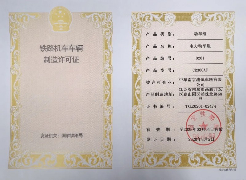 準(zhǔn)予你單位CR300AF電力動(dòng)車組制造許可,并向你單位頒發(fā)相應(yīng)許可證。證書編號(hào):TXLZ0201-02424,有效期至2024年11月13日。