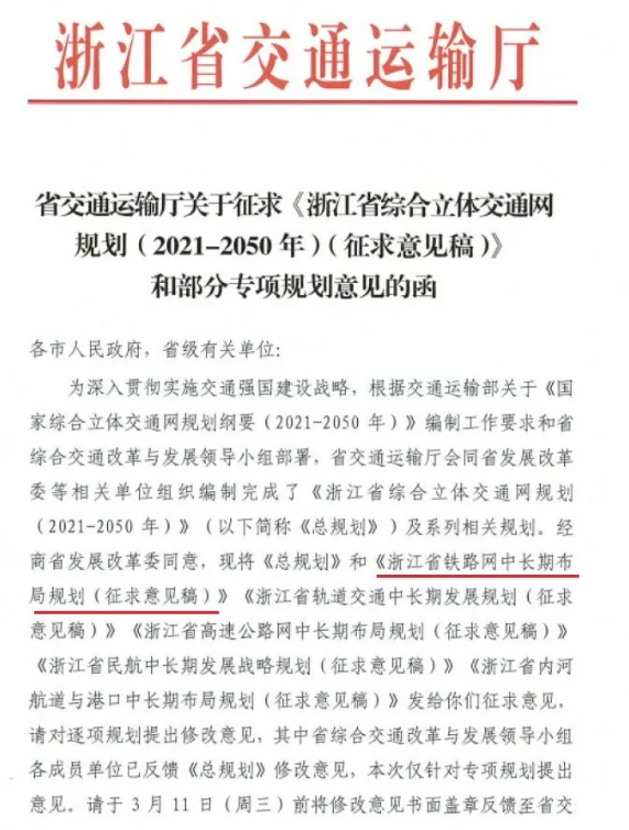 3月6日,浙江省交通運輸廳印發(fā)了關于征求《浙江省綜合立體交通網(wǎng)規(guī)劃(2021-2050年)(征求意見稿)》和部分專項規(guī)劃意見的函。
