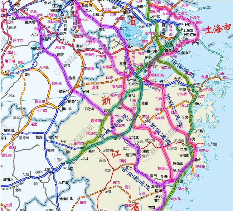 3、寧杭溫通道。南京~杭州~溫州。包括建成的寧杭客專,規(guī)劃建設的寧杭二通道、宣杭城際、鹽泰錫宜湖城際宜興至湖州段,在建的杭溫鐵路、湖州至杭州西至杭黃鐵路連接線。