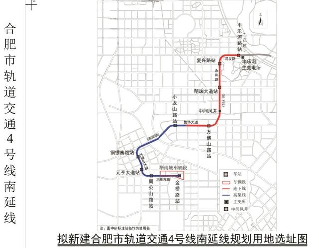 合肥市軌道交通4號線南延線起于金橋路站,主要沿大雁灣路、大潛山大道、繁華大道、永和路敷設(shè),止于4號線豐樂河路站,正線線路全長13.97公里,設(shè)置車站8座,主變電所1座,區(qū)間風(fēng)井1座,車輛段1座。