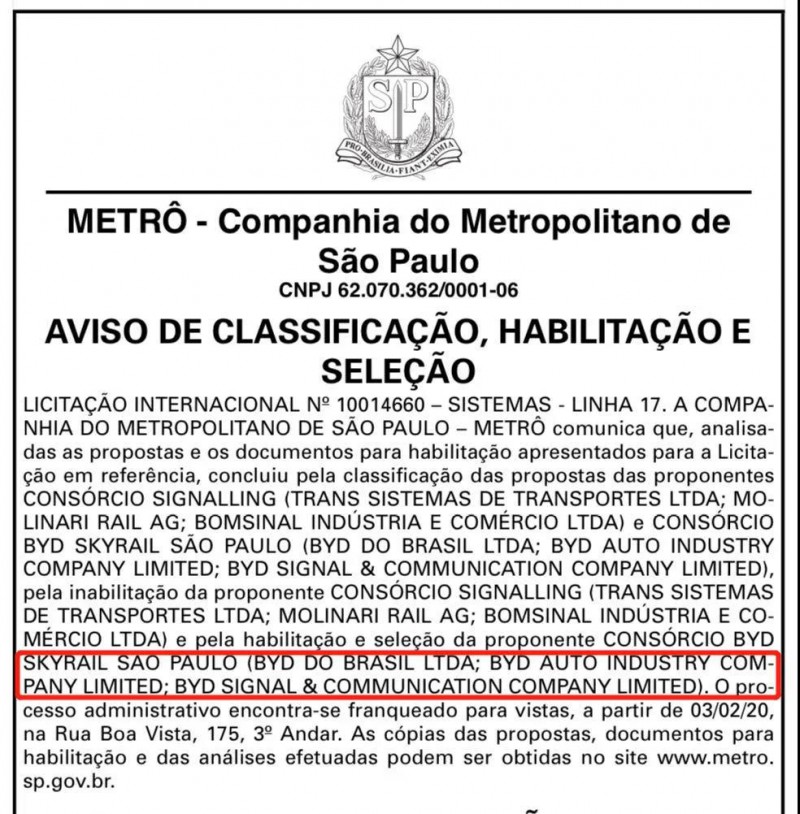 時隔3個多月,在巴西圣保羅,比亞迪又與圣保羅地鐵公司簽署合約,將為圣保羅軌道交通17號線提供云軌解決方案。