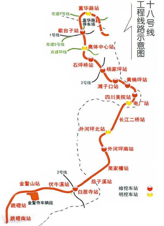 線路全長約29公里,其中地下線長約18.7公里、高架線長約9.544公里,地面線長約0.76公里。全線共設(shè)車站19座,其中地下站12座,高架站7座。這19個(gè)車站平均站間距為1.568公里,其中最小的僅為0.864公里,即四川美院站至電廠站區(qū)間,最大的為2.29公里,位于金鰲山站至跳磴站區(qū)間。