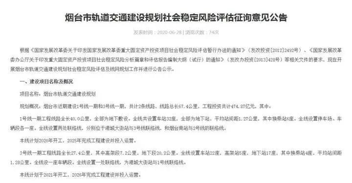 6月28日,煙臺市軌道交通集團(tuán)有限公司發(fā)布了:煙臺市軌道交通建設(shè)規(guī)劃社會穩(wěn)定風(fēng)險評估征詢意見公告。