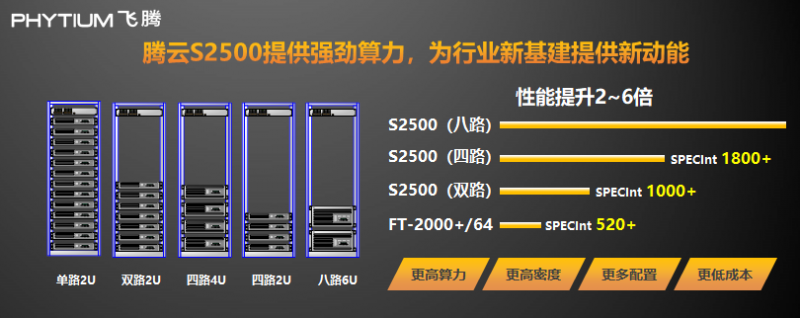 騰云S2500將為行業(yè)新基建提供更高算力、更高密度、更多配置、更低成本的解決方案。例如,一個機柜數(shù)量的FT-2000+服務(wù)器所提供的算力,僅用1/3數(shù)量的S2500四路2U服務(wù)器或1/2數(shù)量的S2500雙路2U服務(wù)器就可以實現(xiàn),系統(tǒng)建設(shè)成本進(jìn)一步壓縮。